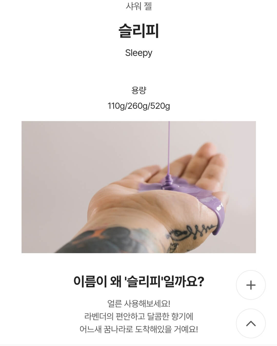 설명: 라벤더와 일랑일랑 향이 어우러진 샤워 젤로, 편안한 수면을 도와줍니다.